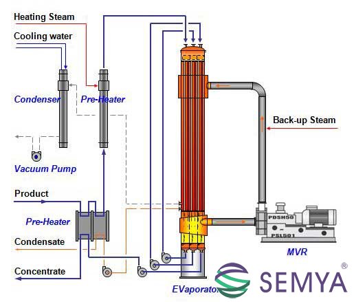 蒸汽機(jī)械再壓縮蒸發(fā)器簡稱MVR蒸發(fā)器,相較于傳統(tǒng)的多效蒸發(fā),是一種高效、節(jié)能的技術(shù)。MVR蒸發(fā)器是指機(jī)械式熱能壓縮蒸發(fā)器,是國際上二十世紀(jì)九十年代末開發(fā)出來的新型高效蒸發(fā)設(shè)備。其工作原理是蒸發(fā)器產(chǎn)生的二次蒸汽經(jīng)機(jī)械式熱能壓縮機(jī)(類似于鼓風(fēng)機(jī))作用后,溫度提升5~8℃,返回用于蒸發(fā)器的加熱熱源,新鮮蒸汽僅用于補(bǔ)充熱損失和補(bǔ)充進(jìn)出料熱焓,從而大幅度減低蒸發(fā)器對外來新鮮蒸汽的消耗。原來要廢棄的蒸汽就得到了充分的利用,回收了潛熱,又提高了熱效率,生蒸汽的經(jīng)濟(jì)性相當(dāng)于多效蒸發(fā)的30效,減少了對外部加熱及冷卻資源的需求,降低能耗,減少污染。
