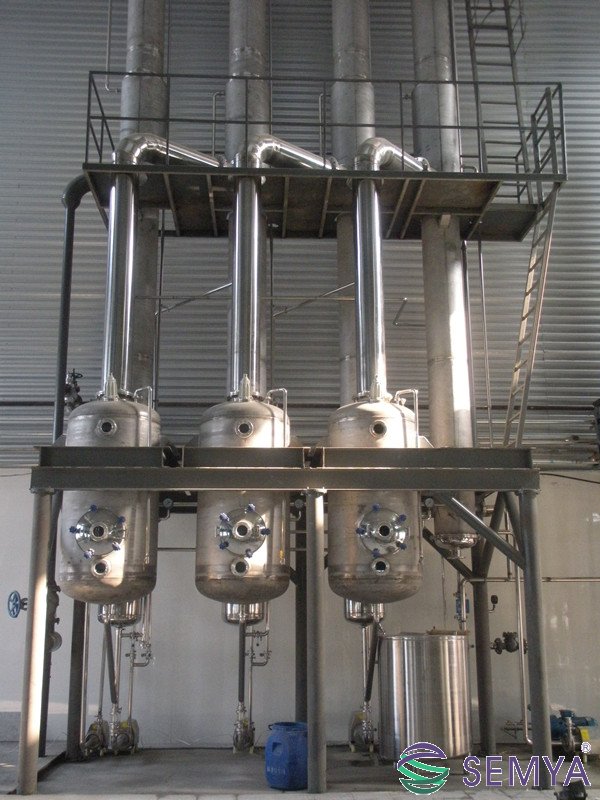 采用降膜蒸發(fā)裝置,將果汁中的水份進(jìn)行蒸發(fā)分離,冷凝水(即軟水)作為紅棗清洗用水或二榨萃取用水、超濾提糖用水,使果汁濃縮,糖度由9~18BX濃縮至70.3±0.2BRIX.